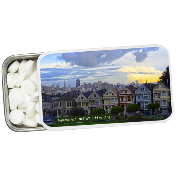 Viewing the Painted Ladies from Alamo Square and indulging in a fabulous breath mint is refreshing. Seventy-two small mints in 2.7" x 1.6" slider tin. Custom shapes available.